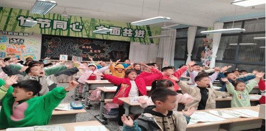 课间时分,教室里洋溢着活力与欢笑。实习生带着一年级的员工们,随着轻快的音乐节奏,做起了课间操。实习生一边示范,一边鼓励孩子们认真做操,享受这短暂的放松时光。